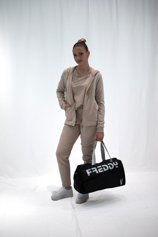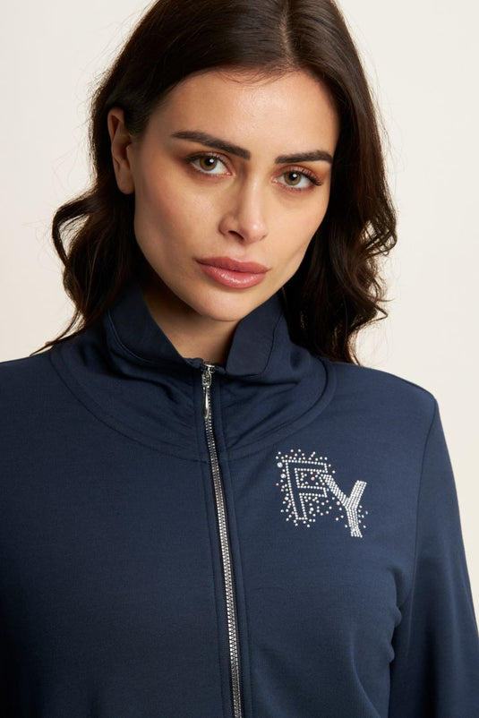Prova il comfort della felpa da donna con cappuccio e zip. Realizzata in felpa di viscosa elasticizzata, morbida e lucente, ha il logo FY in stra...